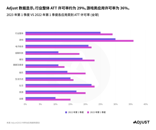 - ATT 许可率再度攀升。数据隐私保护已成为常态,用户对这个话题的理解也在逐渐加深,这也不断推动着许可率地提升。2023 年第 1 季度的全行业平均 ATT 许可率已经达到 29%,年同比提升 4 个百分点。游戏类应用的许可率更是高达 36%。金融科技类应用也从 11% 增加到了 18%。