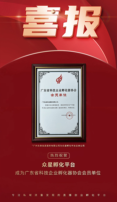 随着我国直播经济的蓬勃发展,并成为推进数字经济发展的主要力量,为更好的联合推动广东省直播企业的孵化,发展出更多具有代表性的直播企业,广东省科技企业孵化器协会(以下简称“省孵化器协会”)于近日正式批准广州永森信息服务有限公司(即众星孵化平台主体公司)为协会会员单位。