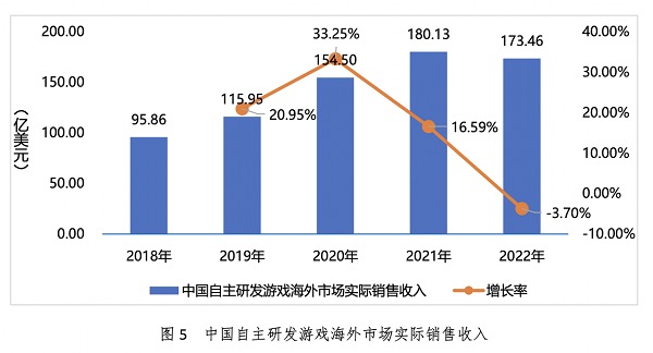 2022年,游戏企业集中转向出海发展的趋势更加明显,整体市场竞争加剧,难度升级。年初发布的《2022年中国游戏出海情况报告》数据显示,2022年中国自研游戏在海外市场收入为173.46亿美元,同比下降 3.7%,为 2018 年以来的首次下滑。
