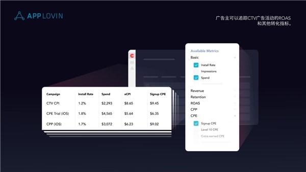 - 为CTV广告量身打造的高效广告素材优化。作为增值服务,AppLovin旗下广告团队SparkLabs还能为客户量身打造高效的广告素材,让客户在节省人力和资源的同时,享用一流的广告素材。