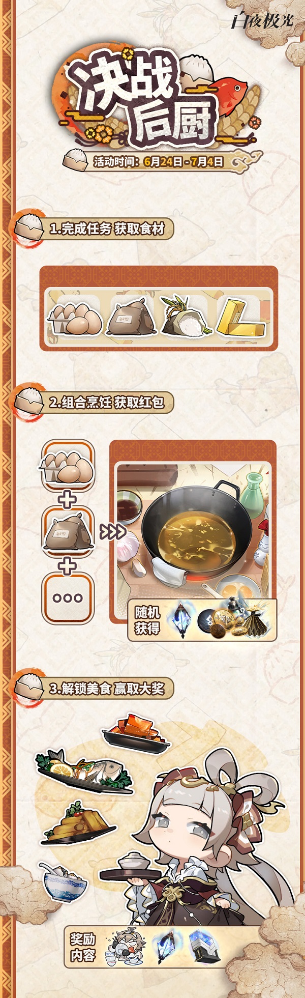 除了能够体验到「薰风海上来」、「卡莲的特别任务」等限时活动任务之外,玩家还能参与「决战后厨」限时小游戏,与丹棠、李天闲一起制作美食,有机会获得光珀、随机养成材料、空裔专属头像「填不饱的空裔」、充能盒等丰富道具。在限时活动开启期间,还将有一大波限时礼包上架,内容超值不可错过!