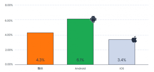 Android平台在拥有低用户获取成本的同时,7日广告支出回报率也相对较高,平均值为6.1%,几乎是iOS平台的7日广告支出回报率的两倍。