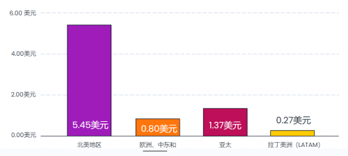 根据《2023中重度游戏应用报告》显示,不同地区的游戏市场和中重度游戏者的习惯差异较大,导致每次安装成本差有较大差异。拉美地区的用户获取成本在垂直领域往往较低,每次安装成本0.27美元;欧洲、中东和非洲地区的每次安装成本排名倒数第二低,为0.80美元;每次安装成本最高的市场是北美地区,达到5.45美元,约为亚太地区(1.37美元)的4倍多。