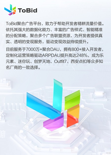 ”ToBid作为专业的聚合广告平台,在合作的过程中,更加了解游戏开发者的需求。其产品本身强大的数据化能力以及夯实的行业沉淀,能够为开发者提供坚实的合作基础。