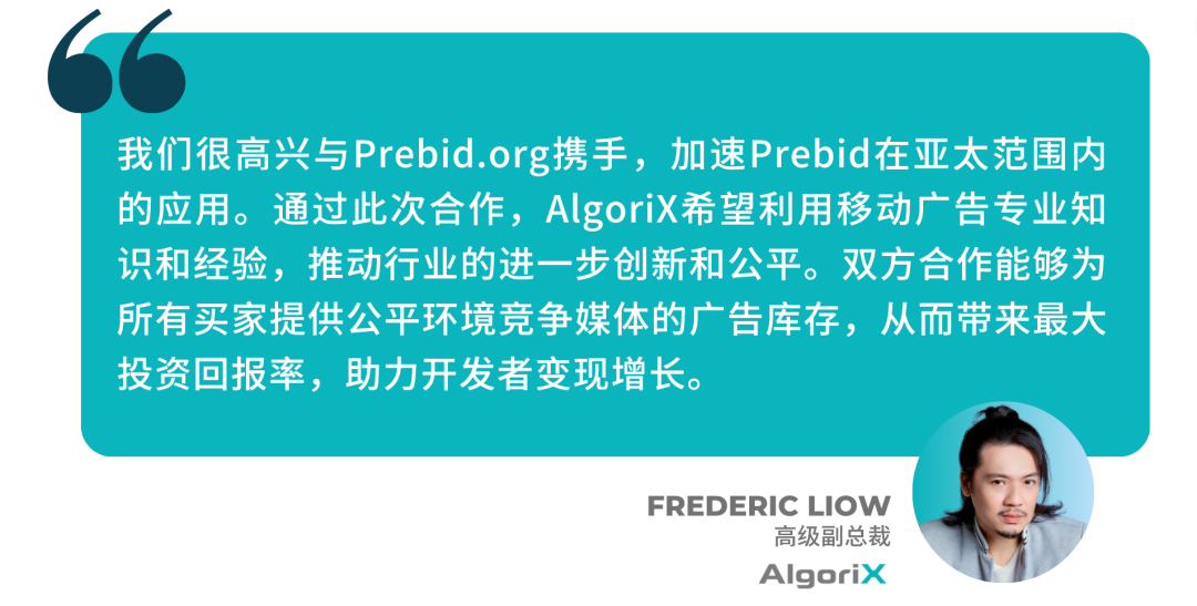 AlgoriX高级副总裁Frederic Liow表示:“我们很高兴与Prebid.org携手,加速Prebid在亚太范围内的应用。通过此次合作,AlgoriX希望利用移动广告专业知识和经验,推动行业的进一步创新和公平。双方合作能够为所有买家提供公平环境竞争媒体的广告库存,从而带来最大投资回报率,助力开发者变现增长。”
