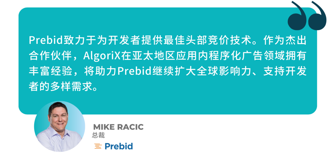 Prebid.org总裁Mike Racic表示:“Prebid致力于为开发者提供最佳头部竞价技术。作为杰出合作伙伴,AlgoriX在亚太地区应用内程序化广告领域拥有丰富经验,将助力Prebid继续扩大全球影响力、支持开发者的多样需求。”