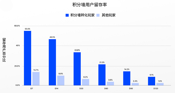 数据还显示,积分墙所转化玩家的留存率也明显提升,从第 7 天到第 120 天,其继续玩游戏的可能性最高增加 5 倍,该优势在后期阶段更为显著。如在第 90 天,积分墙转化用户的留存率为 14%,而其他玩家则低于 3%。