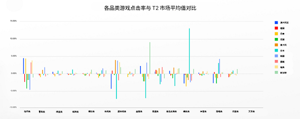 以日本为例,在该地区投放体育类游戏广告的效果十分理想,点击率(CTR)比所有 T2 国家的平均值高出 13%。然而,竞速或超休闲类游戏的广告投放到该地区的点击率则低于平均水平 7%。