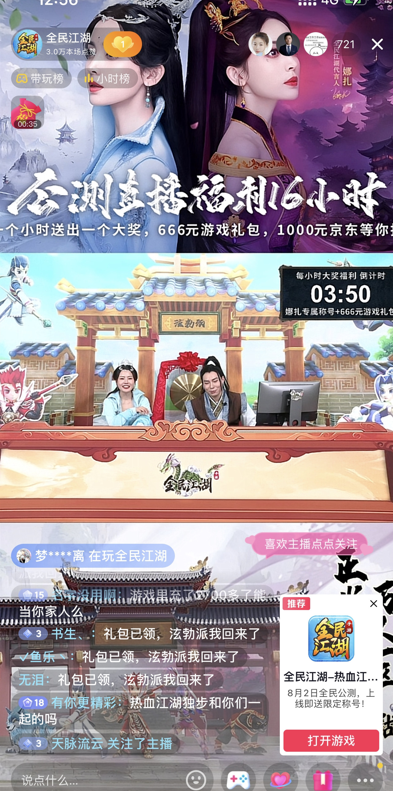 在线上,贪玩在向不同流媒体平台投放《全民江湖》的开屏广告之余,也在抖音平台的官方号上开展"连续直播16小时,送公测福利!"的活动,将游戏内容及福利直接触达用户,增进营销转化。