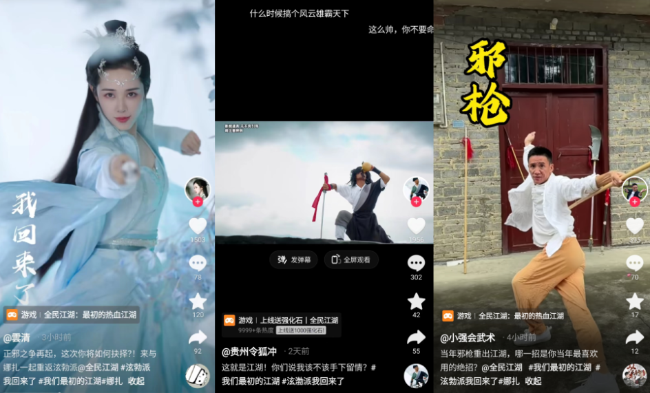 除了当下已知会发布的古力娜扎主演的TVC,贪玩游戏还在抖音平台推出了为期半个月的UCG创作激励计划,并与武打类、特效类、游戏推荐类KOL合作推广#泫勃派我回来了# #我们最初的江湖#等UCG话题的传播。此外,贪玩近年比较热衷的非遗、景点联名活动也可能在未来推出。届时,贪玩还将带起新一轮的营销活动。