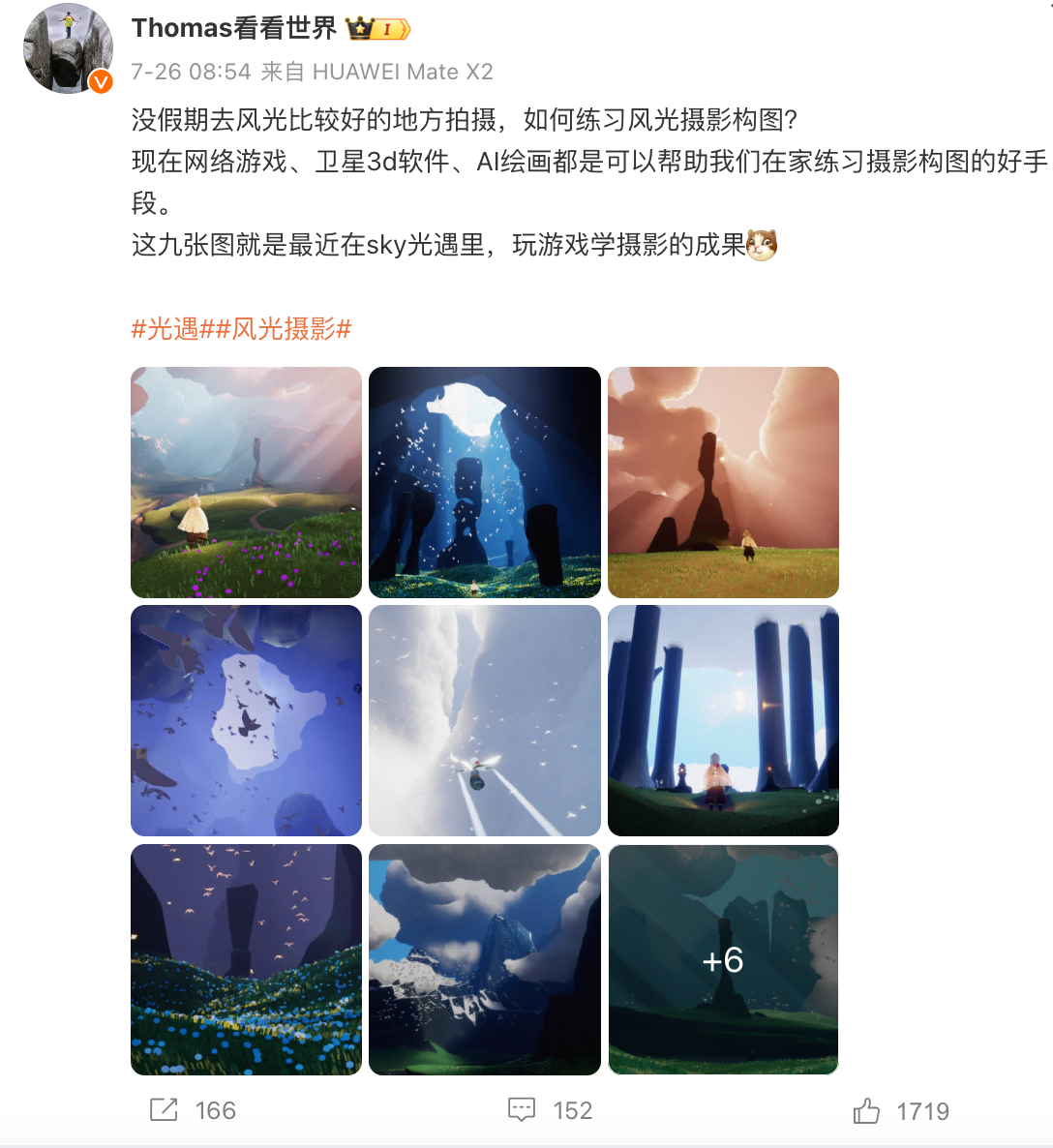 更值得一提的是,这个多功能相机的效果甚至吸引了不少摄影爱好者的关注并且加入到这次“跨界摄影”狂欢中,例如曾获得国家地理摄影大赛金奖的博主@Thomas看看世界 就在微博主动分享了在游戏里用相机记录自然风光的作品,这无疑也是对相《光·遇》风格出片效果的肯定。