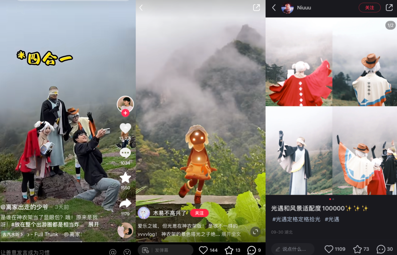 而且在景区现场,他们的热烈分享也带动了很多游客,许多不了解《光·遇》的游客也纷纷拿起手机的相机,拍照合影留念并分享到社交平台上。抖音相关话题在短短3天内,视频播放量增加了超1500w,小红书上也涌现出上百条拍照分享的帖子,让《光·遇》带着神农架一起火出了圈。