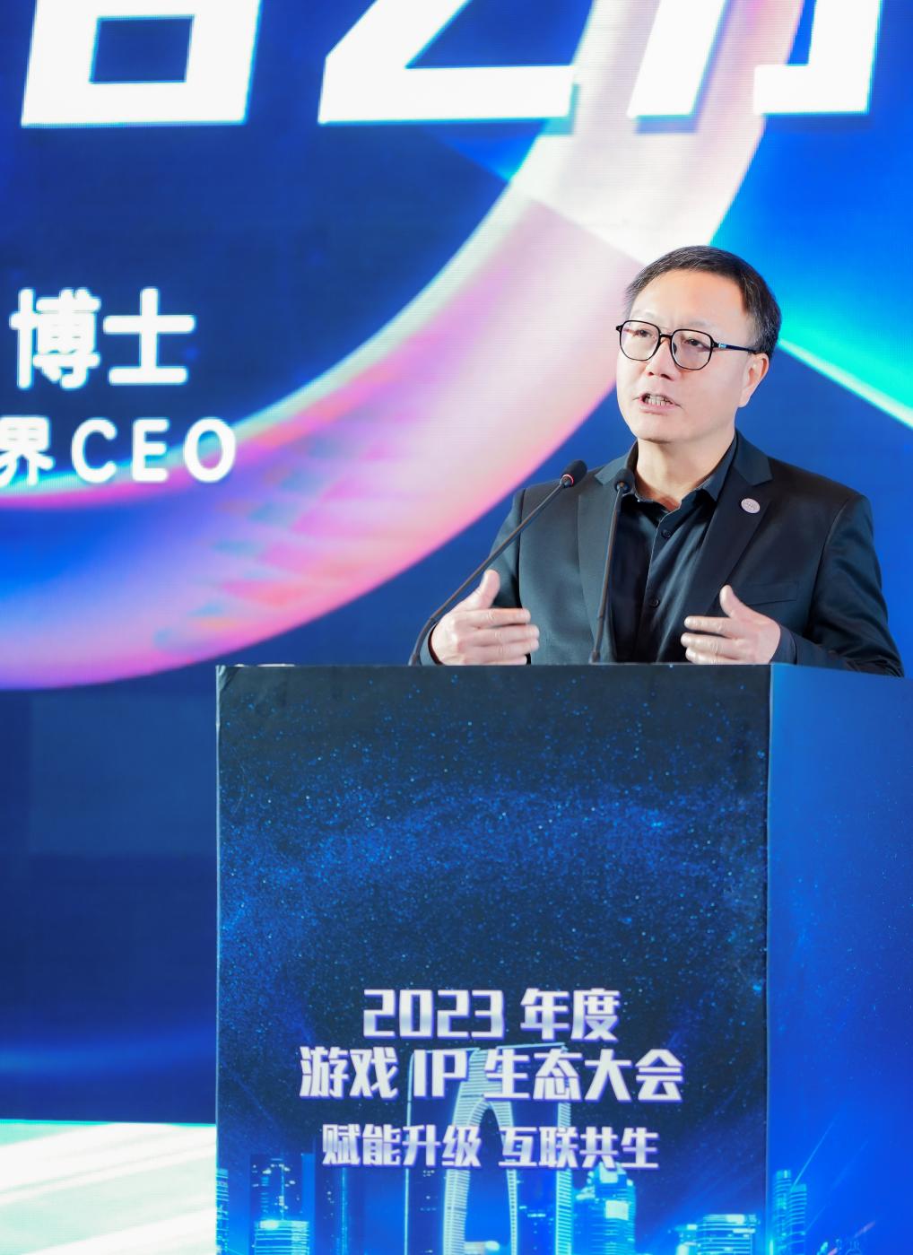 图为萧泓博士在2023年度游戏IP生态大会上发表主题演讲