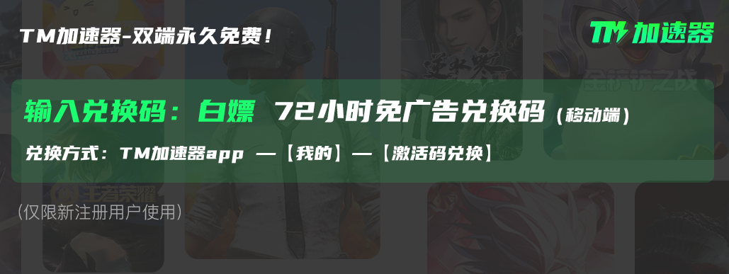 TM加速器-双端永久免费(https://www.tmjiasuqi.com/),新用户使用兑换码【白嫖】还能领取72小时免广加速时长。