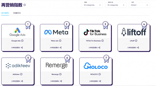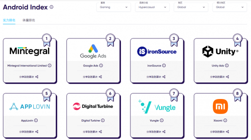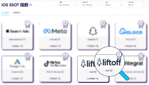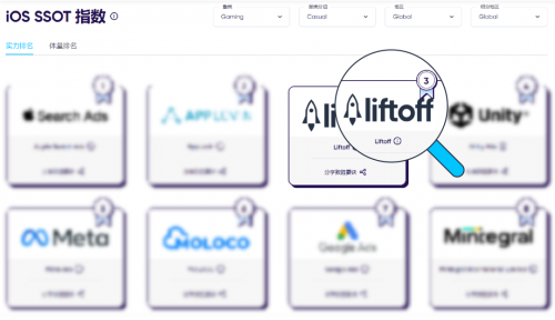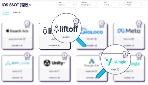 来看看 Liftoff 取得的亮眼成绩(图示排名中,Liftoff 为 Liftoff Accelerate 产品,Vungle 为 Liftoff Direct 产品,Liftoff Accelerate 和 Direct 各具优势,帮助广告主通过 AI 赋能的程序化广告技术获得新用户,实现稳定的收益)