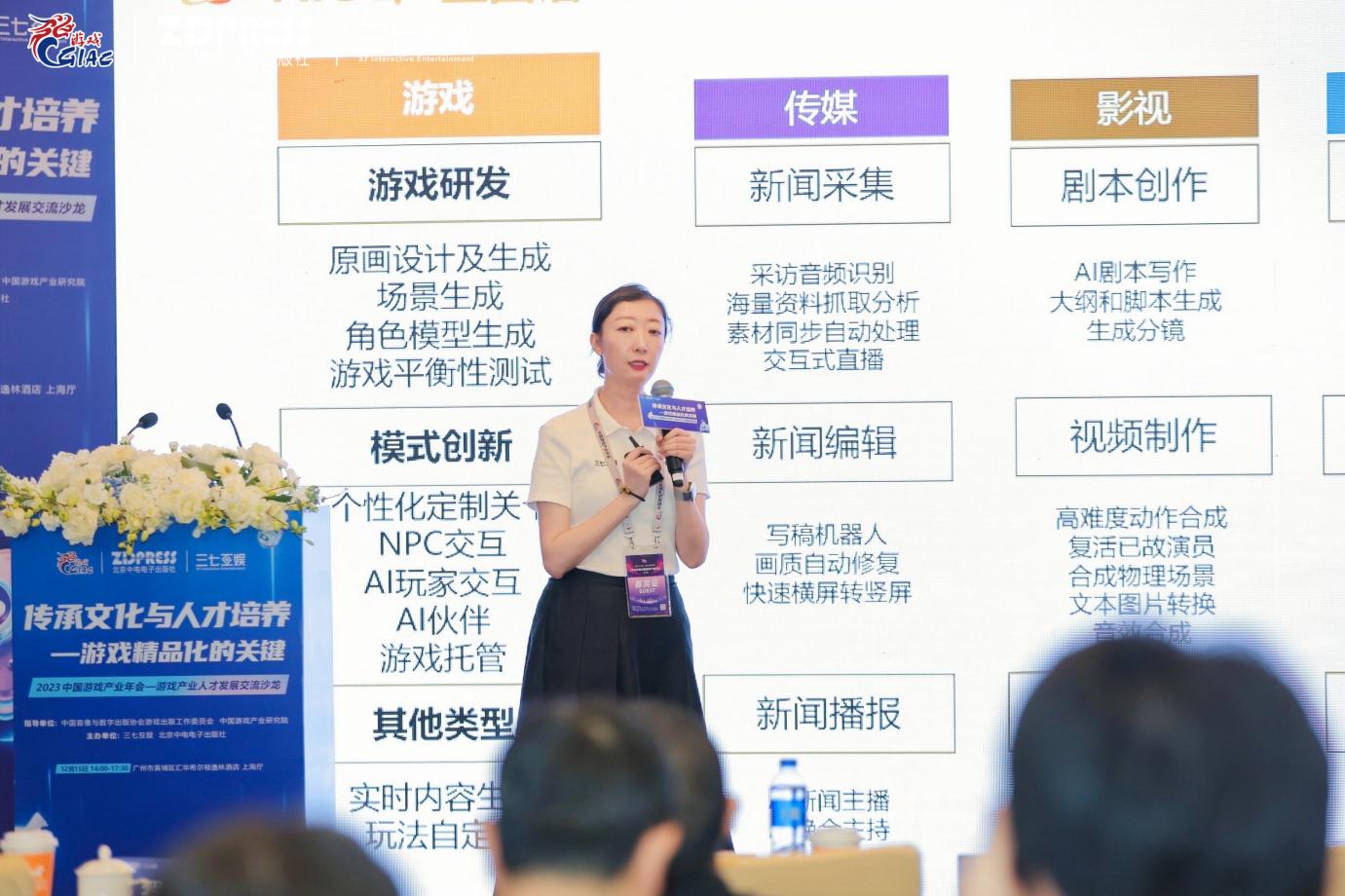 三七互娱集团副总裁、CHO罗娟女士做了主题为《AIGC时代,游戏行业的人才如何拥抱变革》的演讲,从AIGC发展历程到实践应用、人才趋势洞察、人才变革和人才新要求,为游戏行业人才详细剖析了现状并提出了诸多行动建议。