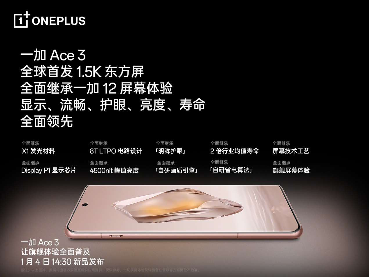 12 月 28 日,一加官宣一加 Ace 3 将全球首发 1.5K 东方屏,全面继承一加 12 屏幕体验。一加 Ace 3 东方屏支持自研「明眸护眼」技术,采用行业领先的 8T LTPO 电路设计,拥有行业第一的 4500nit 峰值亮度和行业普通屏幕 2 倍以上的屏幕寿命,显示、流畅、护眼、亮度、寿命全面领先。