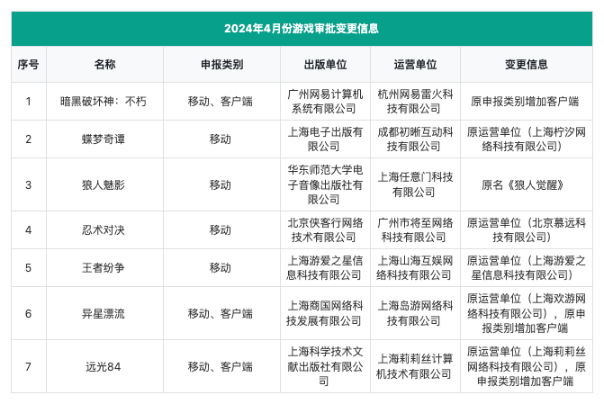 最后,今天版署还新增了一批游戏版号的变更消息,其中比较值得注意的是:网易的《暗黑破坏神:不朽》和莉莉丝的《远光84》都新增客户端版号;