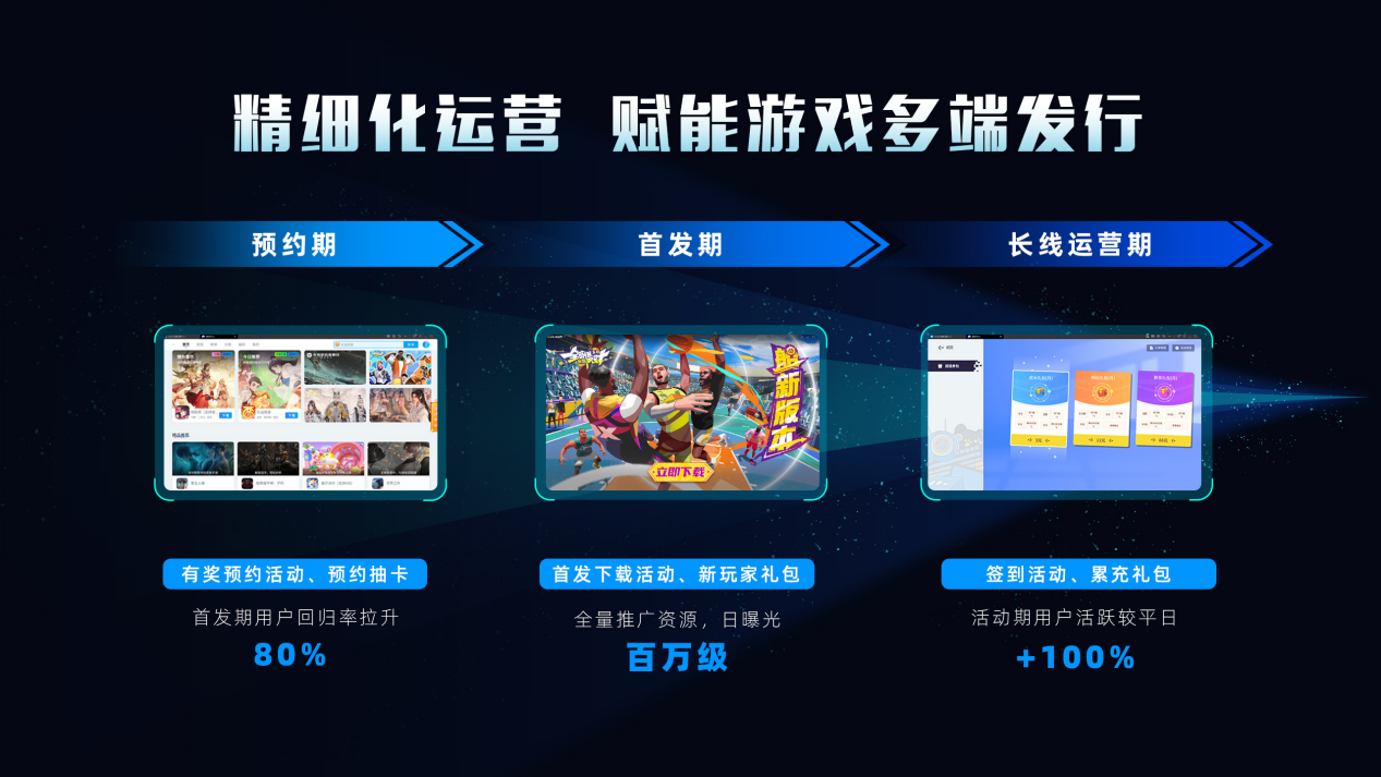 通过深度整合行业资源和技术优势,MuMu开放平台为游戏厂商提供了从游戏接入、测试、发行到运营的一站式服务,实现游戏在PC平台上的快速部署和稳定运营。MuMu开放平台能够根据游戏发行的不同阶段和需求,为玩家定制丰富的运营活动,覆盖从测试期、首发期、长线运营期的游戏全周期,并配合百万级的资源日曝光,将优质游戏精准推荐给感兴趣的用户。MuMu开放平台具备千人千面、用户标签分群、定向推荐等技术能力,能够通过精细化运营达成流量高效利用,实现用户精准转化,助力游戏迅速成长与长线经营,为游戏厂商带来更多的收益。