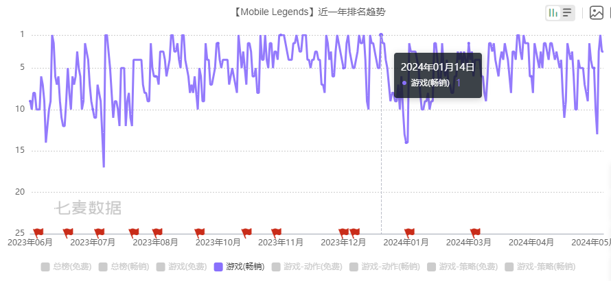 其次,从游戏表现来说,《MLBB》常年处于保持在哈萨克斯坦的iOS游戏畅销榜Top10之前;而每当重大节日或者版本更新时,游戏往往还能登顶榜首。