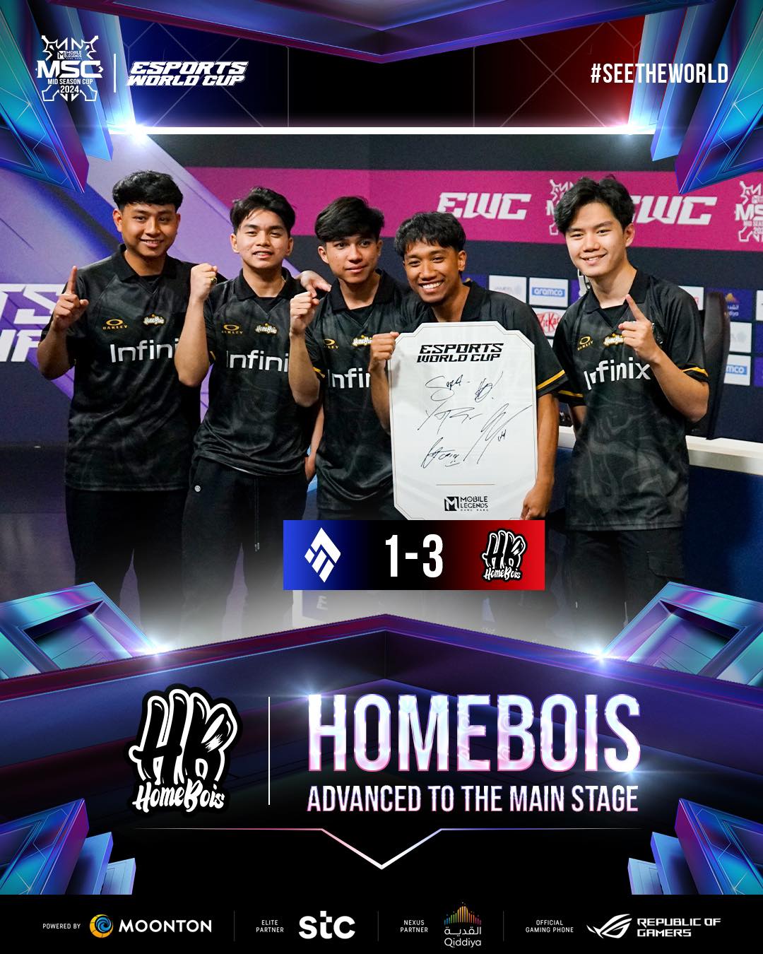 6月30日,为期3天的电竞世界杯决胜巅峰(MLBB)暨决胜巅峰全球季中杯(MSC)外卡赛在沙特利雅得落下战幕。B组第一名的马来西亚战队HomeBois以3-1的比分击败了A组第一名的秘鲁战队Entity7,赢得晋级小组赛的最后一个名额,接下来将与其他15支战队向MSC冠军宝座发起冲击,争夺300万美元奖金池。