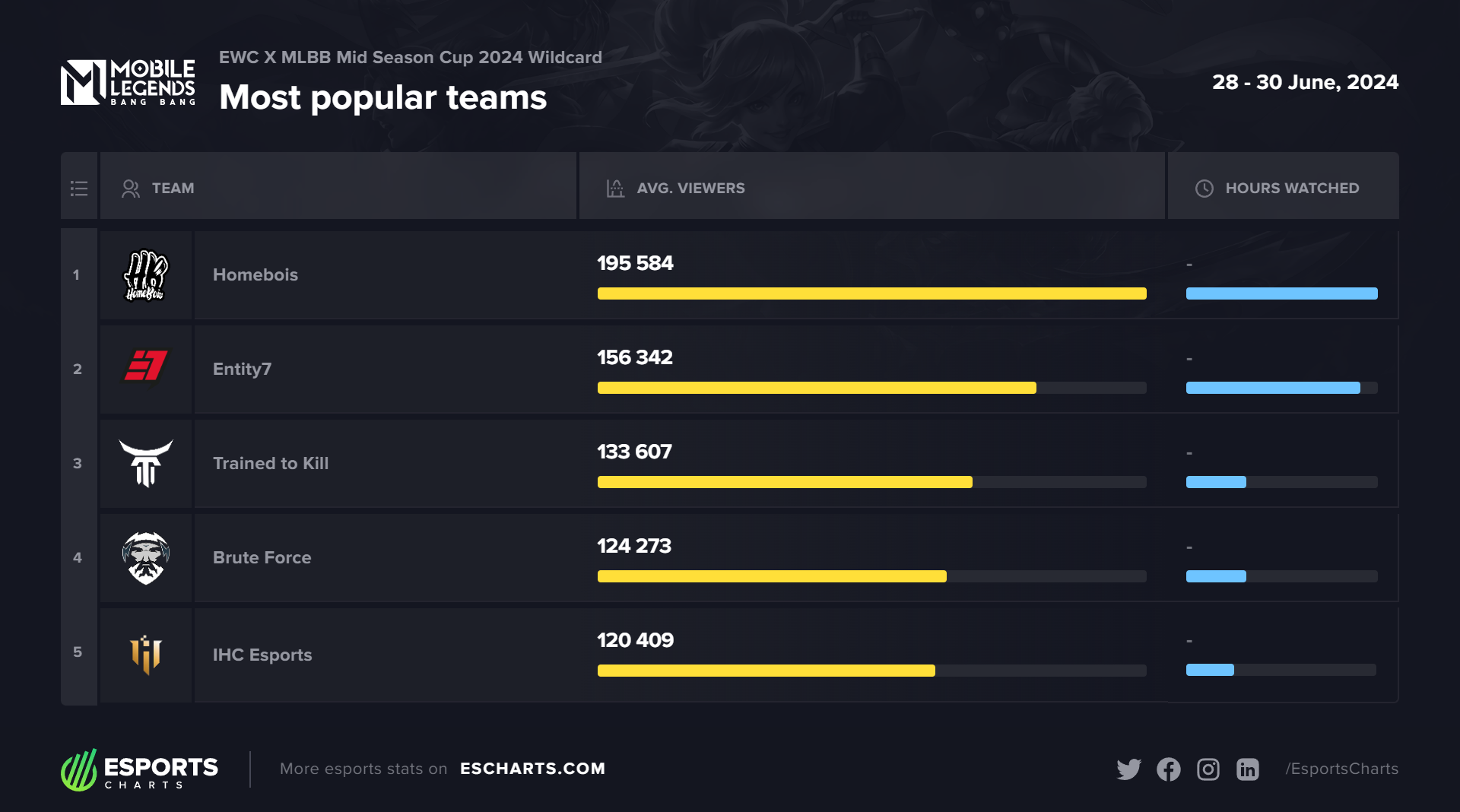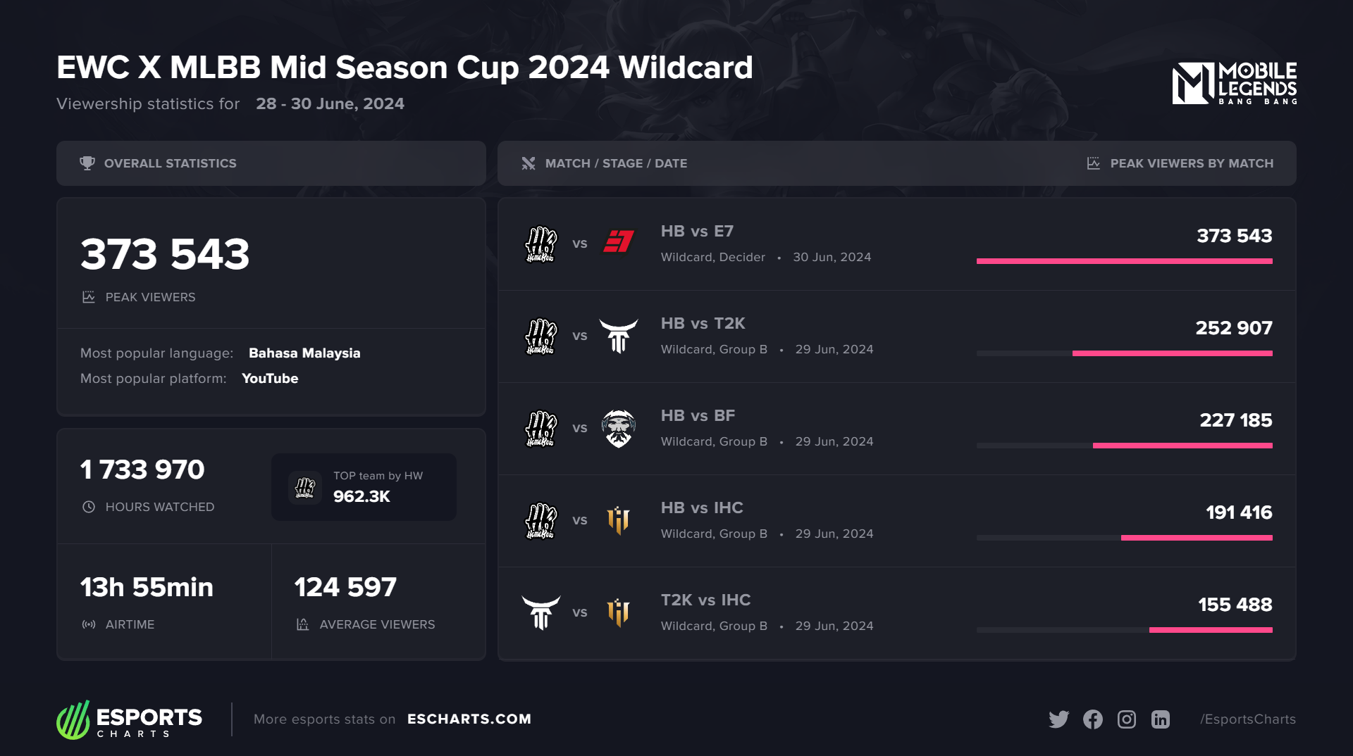 据三方权威电竞数据网站Esports Charts统计,本届MSC外卡赛以37万的观看峰值人数,突破去年M5世界赛外卡赛27万的收视记录。其中,外卡阶段收视排行前五名的比赛中,HomeBois占据四场,就平均观众数而言,这支马来西亚战队被宣布成为外卡赛最受欢迎战队。