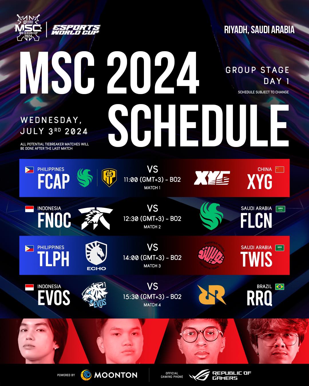 7月3日至7日,MSC正赛小组赛正式开打,中国战队XYG将与M5世界赛冠军菲律宾战队Falcons APBren打响揭幕战。淘汰赛将于7月10日至14日举行。