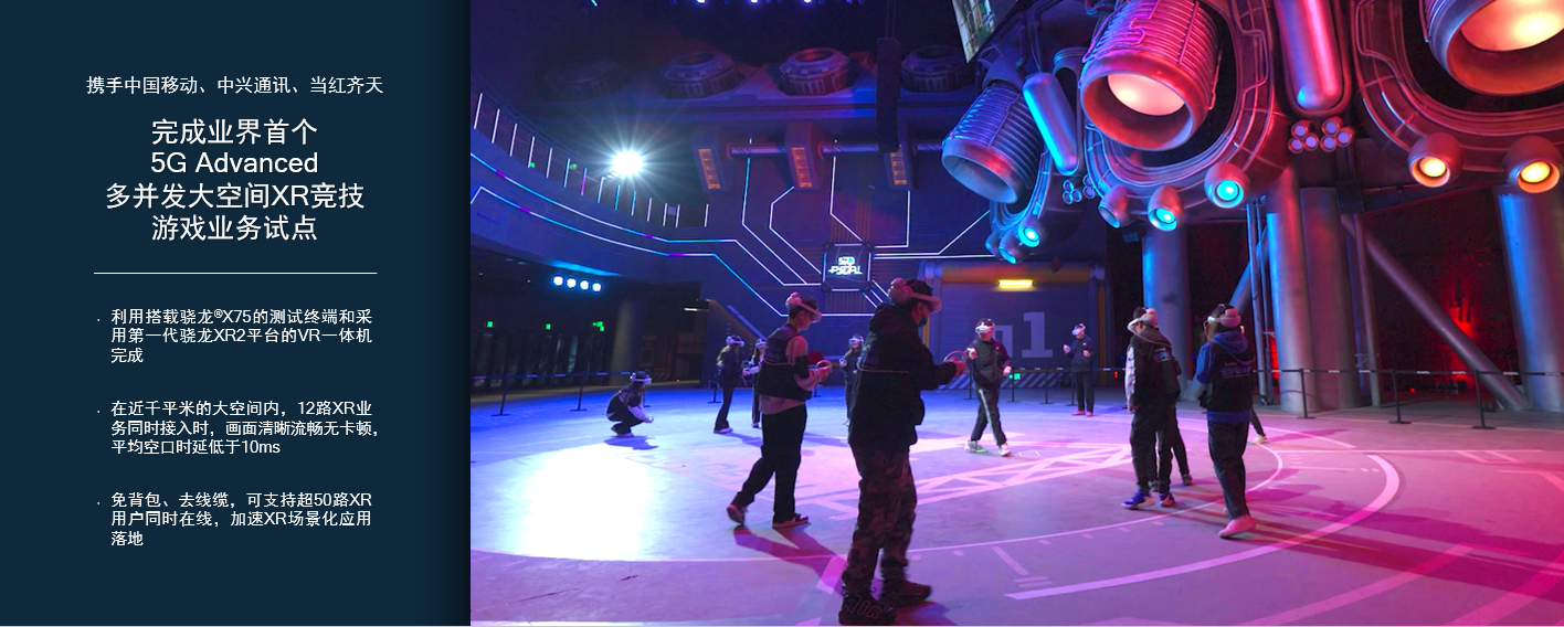 我们认为,在释放更多应用潜能的同时,5G Advanced也正开启“无线AI”时代。无线通信技术和AI的融合,为行业未来的无线变革带来了独特机遇,也为数字娱乐体验迎来新拐点提供了更进一步的技术支持。举例来说,图中场景是在北京首钢园进行的XR领域应用实例。今年2月份,我们携手中国移动、中兴通讯和当红齐天,在当红齐天首钢一高炉SoReal科幻乐园项目,完成了业界首个5G Advanced多并发大空间XR竞技游戏业务试点。这个试验利用搭载高通解决方案的终端,在近千米的大空间里,12路XR同时接入时,画面非常清晰,特别沉浸,完全流畅无卡顿,平均空口时延低于10ms,免背包、去线缆,人可以舒适的自由移动,可以支持超过50路XR用户同时在线,极大扩展了XR场景化应用空间。这将大大推动XR数字娱乐体验的继续升级。