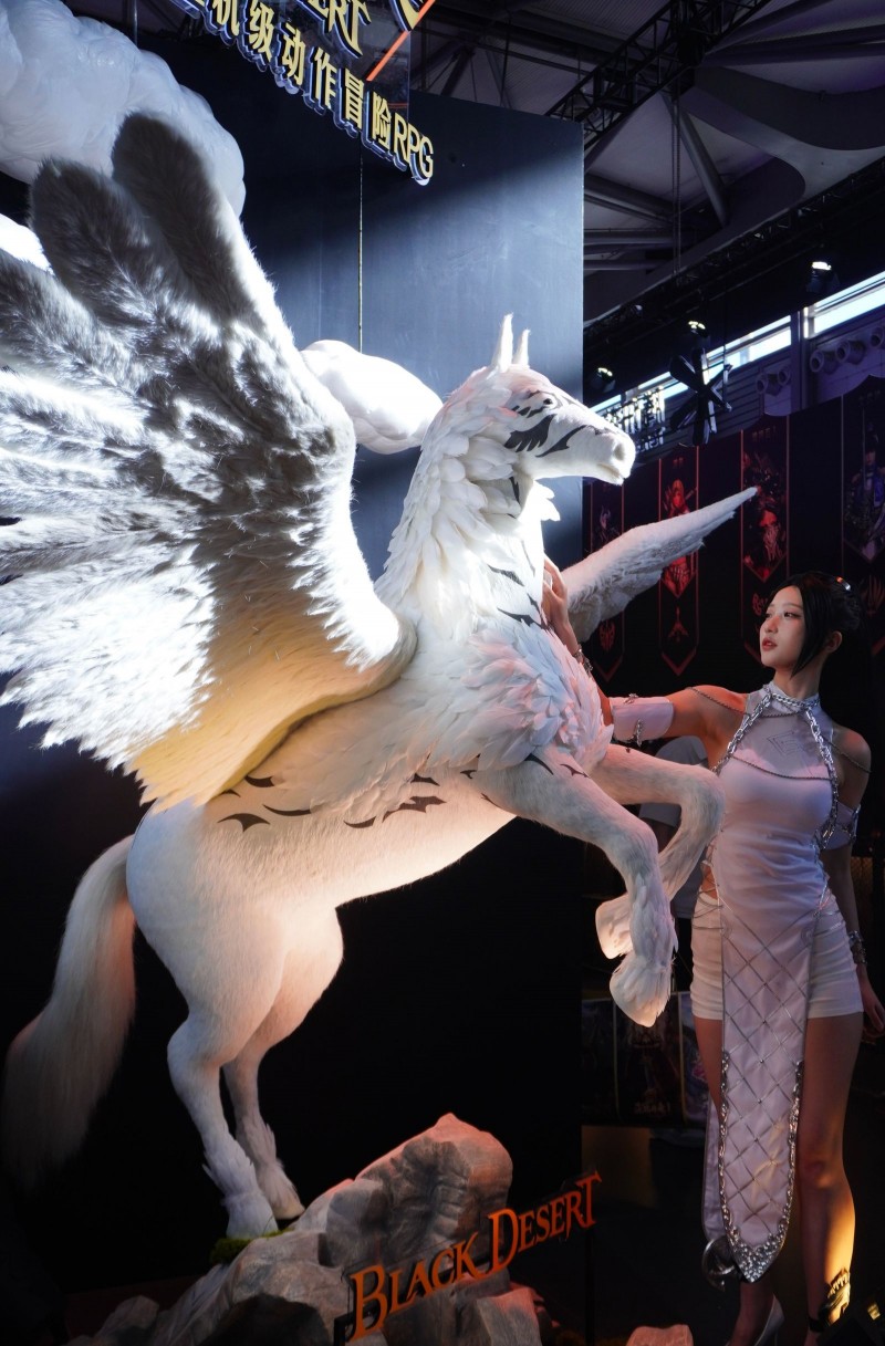 在《黑色沙漠》展区,充满熟悉“黑沙”感的展区设计受到了众多玩家的喜爱。其中,1:1比例还原游戏中玩家的梦想坐骑——幻想马,作为展区门面,更是成了众人争相打卡的对象。