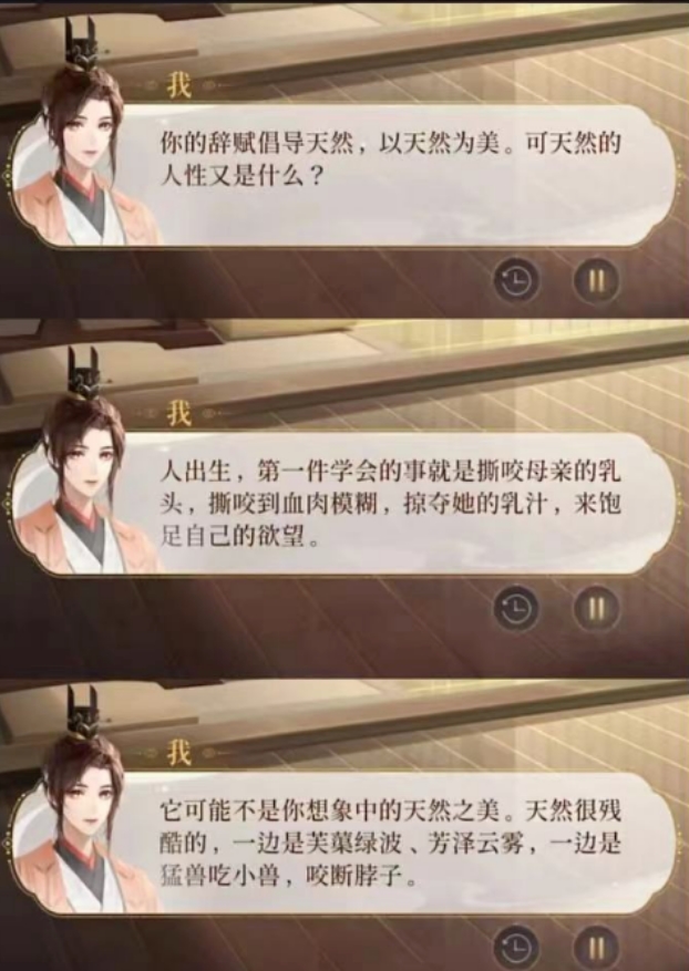 她不再强调女性身上温柔、善良、需要保护的一面,而是突出了女性聪明、坚韧、甚至有野心的一面。娱乐资本论印象很深刻的,是游戏前期广陵王进宫赴宴,有个小宫女奉命要拖住她的脚步,在这里玩家可以选择直接威胁小宫女把她吓走,这在其他游戏中是很少见的。