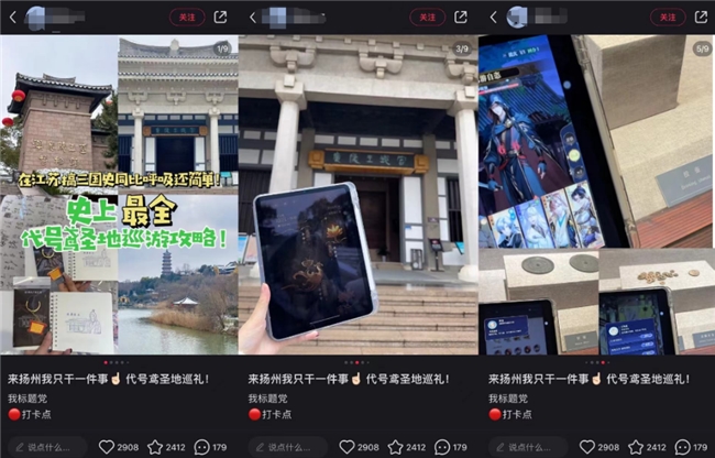 广陵王的封地是现在的扬州,去扬州旅游时就看到了不少玩家装扮成广陵王的模样“故地重游”,他们还会去当地博物馆、纪念堂等地去打卡做攻略分享。娱乐资本论了解到,扬州汉陵苑原本不算是大热门景点,但因为它又名汉广陵王墓博物馆,从去年开始人流量呈现上升趋势,娱乐资本论一位家住天津的朋友,去扬州旅游时特别跑去打卡合照,因为“这一刻感觉千年前的我,正看着现在的我”。
