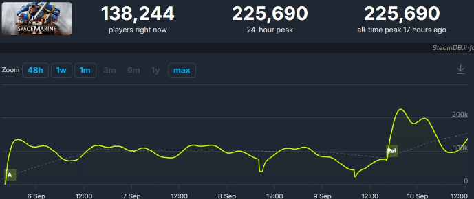 在9月3日~10日的Steam热销周榜中,《战锤40K:星际战士2》将此前连续数周霸榜的《黑神话:悟空》从榜首位置拉下马来。SteamDB的数据则显示,在标准版9月9日开售后的短短24小时内,《战锤40K:星际战士2》在Steam的同时在线玩家数峰值已经达到22.56万,在今年进入Steam商店的所有新游戏中排名第8。