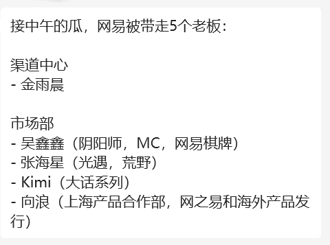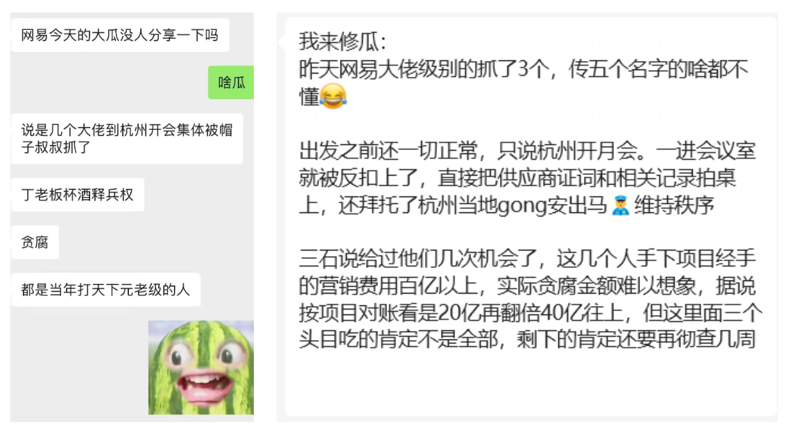 今日(11月7日),业内多个行业交流群开始疯传“网易内部曝出贪腐,多名高管或涉及上亿金额”的聊天截图。没过多久,包括凤凰网科技、雷锋网等媒体发布报道,称“近日网易游戏内部严查贪腐,涉及营销线多名高管,网易游戏市场部总经理向某等人已被带走调查。”