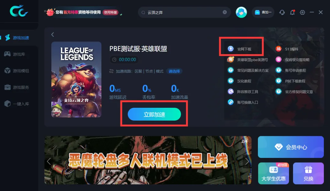 美测服端游加速教程:打开CC加速器PC电脑版---搜索“云顶之弈”---选择【PBE测试服·英雄联盟】---点击右侧【官网下载】---安装成功后回到CC加速器点击【加速】