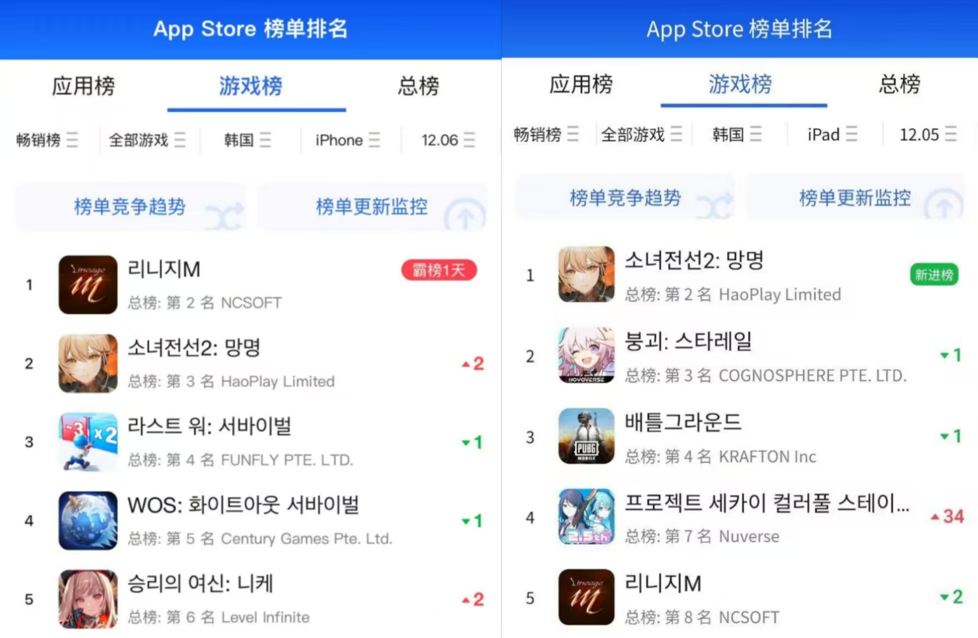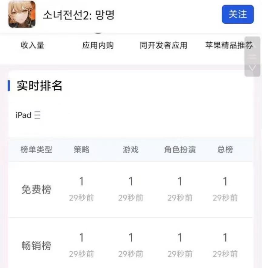 不过,《少前》当年从上线到拿下韩国iOS畅销榜第1,时间跨度有约莫小半年。相比之下,《少前2》从上线到拿下韩国iOS畅销榜第2,仅仅只花了一天。