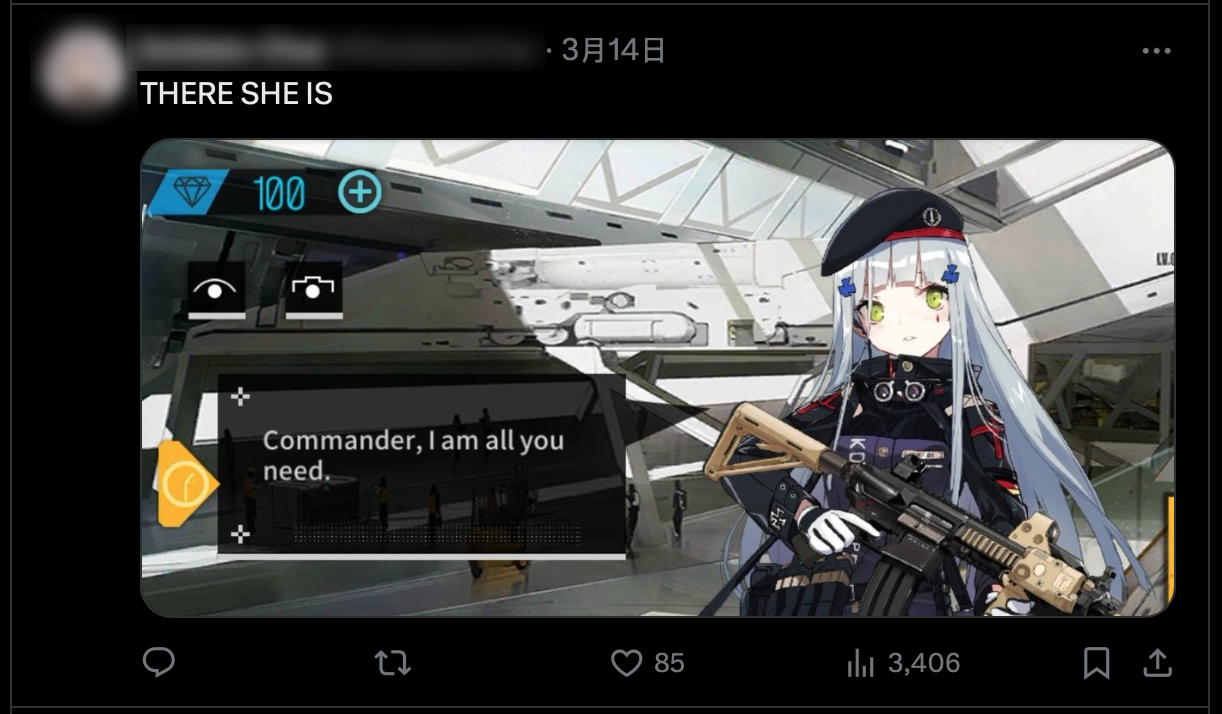 而HK416那句“指挥官只要有我就够了”的台词,也戏剧性地从最初对枪械卓越性能的自信宣言,逐渐被玩家解读为对指挥官的占有欲、到了《少前2》可露凯又回到了对强度清晰的自我认知。