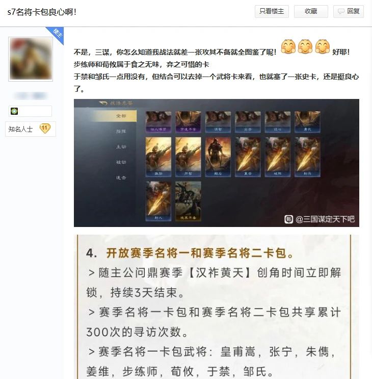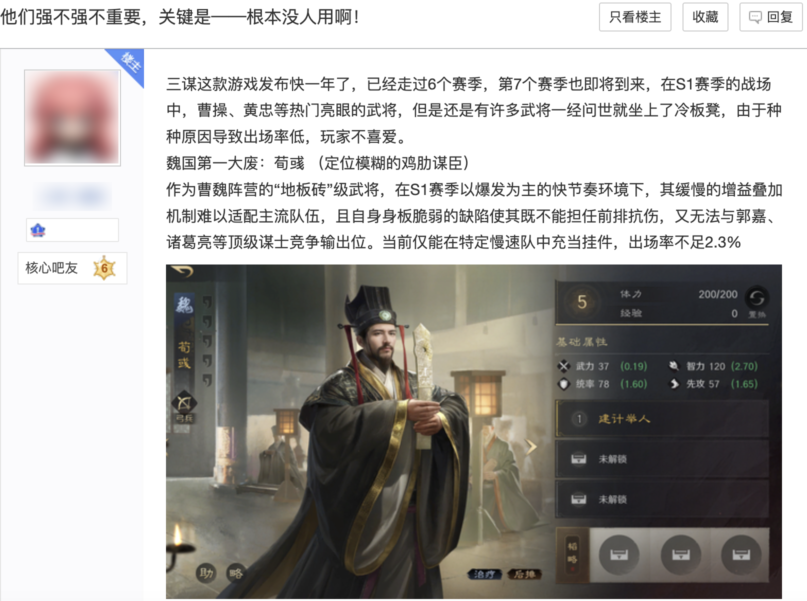 有用户在贴吧发长文吐槽部分武将的出场率过低