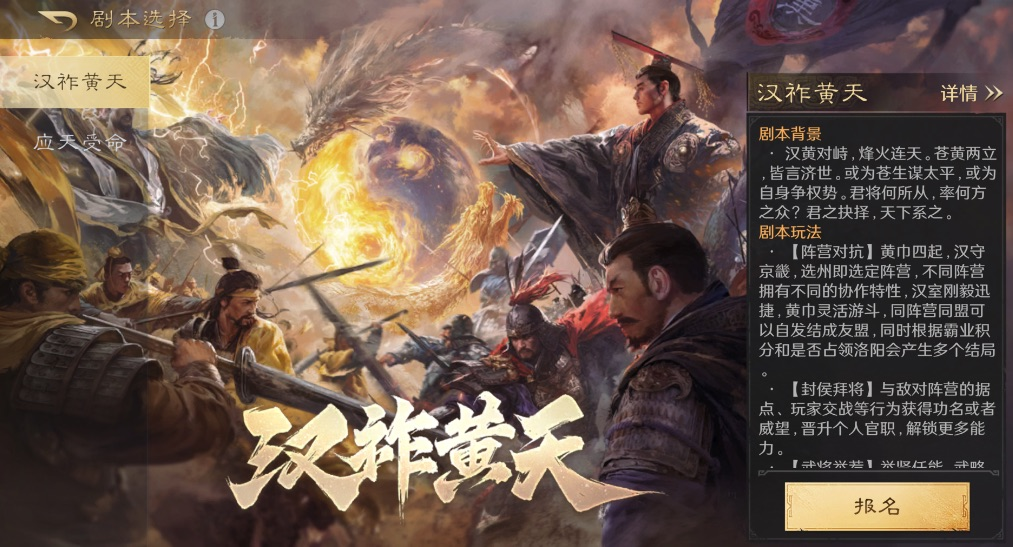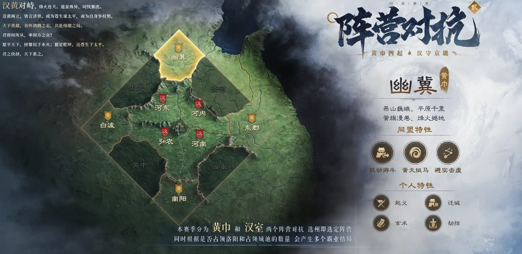 不同于以往赛季以“同盟”为单位的对抗,在「汉祚黄天」剧本中玩家划分成两个大的阵营:黄巾和汉室,同阵营之间的战斗不会产生经验和武勋,同阵营的关系可以转为“友好”,但不同阵营仅能“敌对”,值得注意的是:「汉祚黄天」剧本没有中立关系。