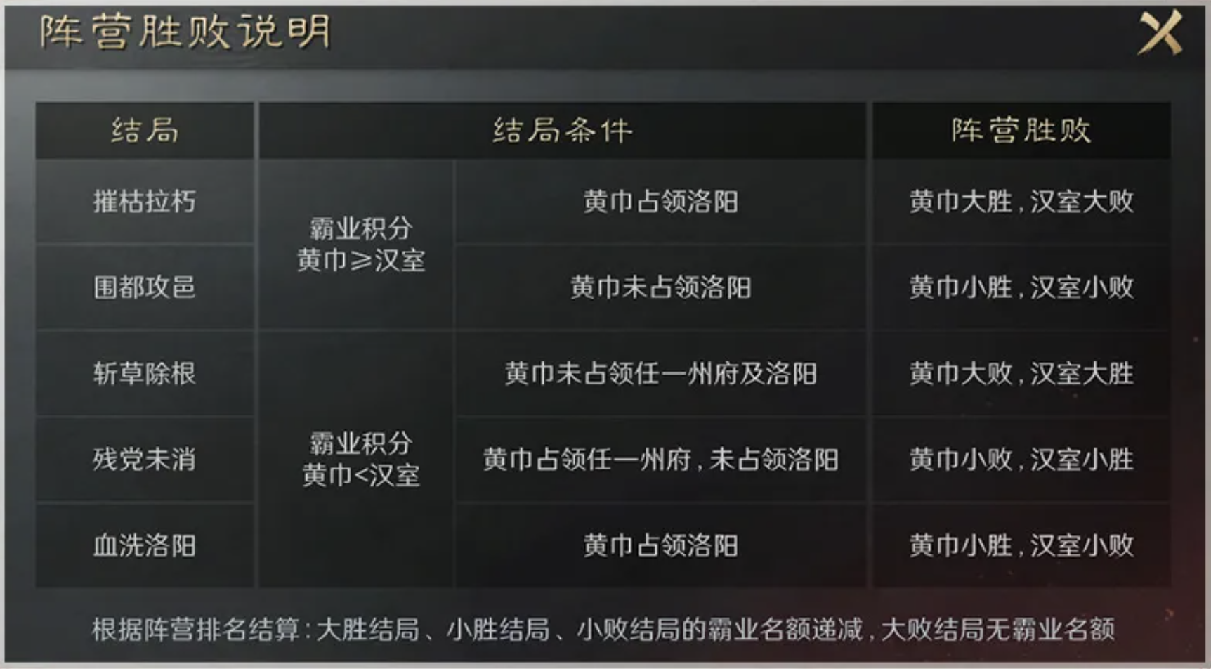 赛季结算按照两大阵营「是否占领洛阳」&「霸业积分」解锁不同的结局以及问鼎、霸业的名额,玩家在阵营积分榜的排名以及所在阵营的结局豆浆决定个人是否获得霸业名额,这就意味着,同盟之间的“背刺”收益基本降到了0。