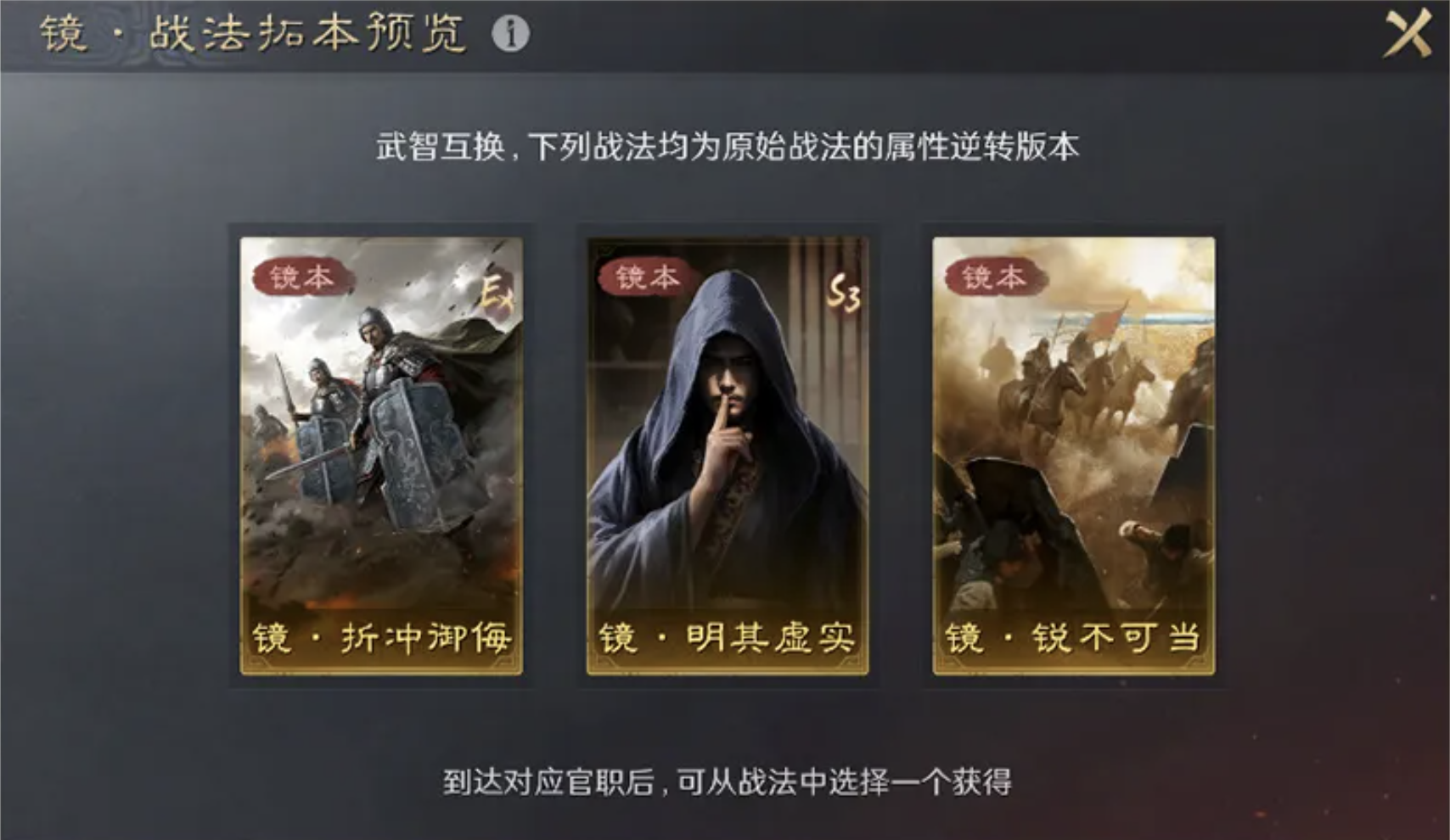 针对“武将阵营固定”,新赛季玩家到达一定官职之后就会解锁「武将举荐」系统。每个举荐武将拥有10个「武略点」,消耗武略点可以解锁特殊能力,例如改变战斗定位或者技能效果等等,每个特性消耗不等,不同的分配方案有不同的效果;而「镜像战法」则是将会逆转战法的影响属性和生效属性。