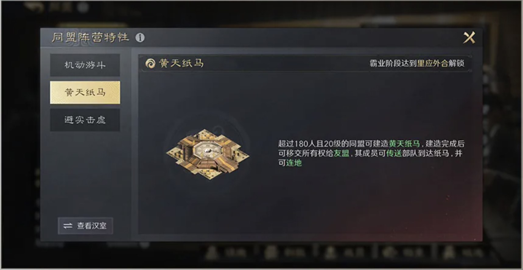 黄巾阵营则可以通过建造「黄天纸马」实现部队的瞬间转移