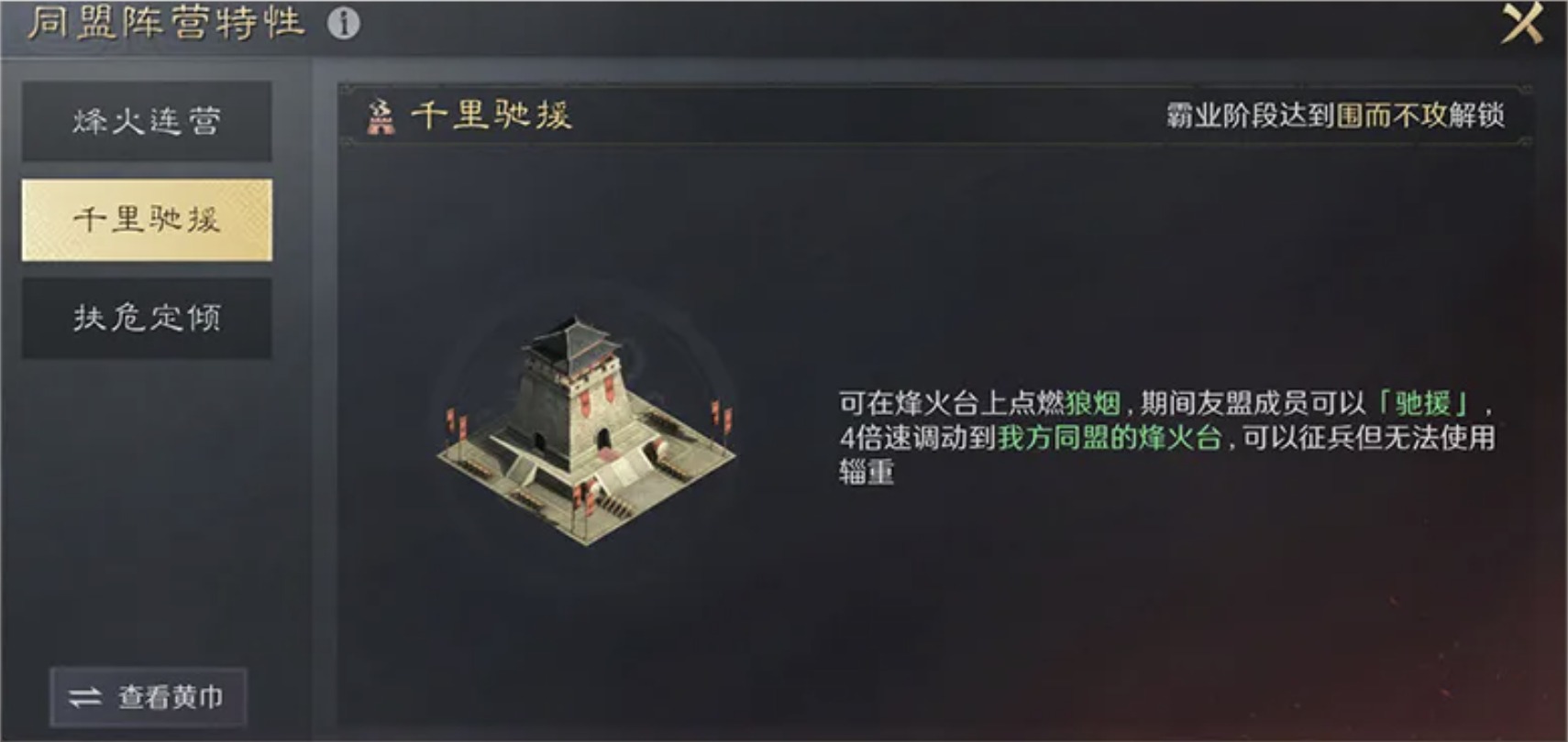 汉室阵营可以通过「烽火台」设施实现友军的四倍速支援