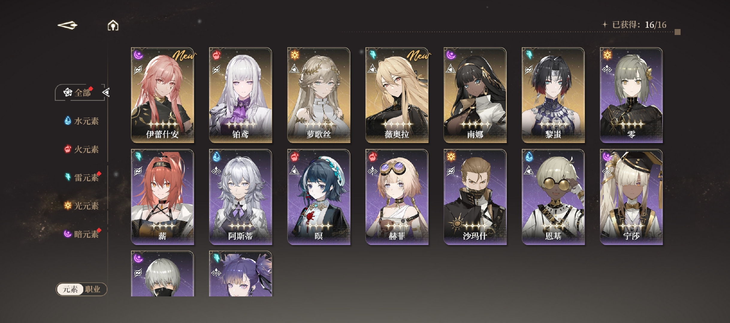 从上线版本来看,目前国际服一共拥有十六名可操作角色,分为光、水、火、雷、暗五种元素。在战斗中进行攻击会让敌方叠加异常状态,根据敌人元素弱点来进行阵容搭配则会打出克制关系,机制方面同样没有太多理解难度。