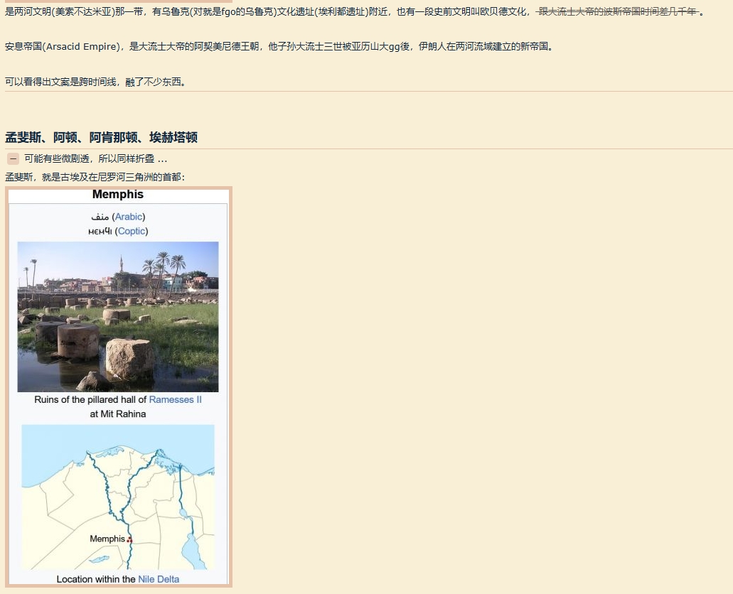 据部分“考据党”玩家分析,游戏中的不少人名、地名都能从各种文献资料中找到出处。例如,楔文会的创始人「埃利什」源自史诗《埃努玛·埃立什》,汇集了苏美尔民族的创世思想;巴别塔所在地「欧贝德」,在历史上为苏美尔文明的源头——欧贝德文明;而游戏中欧贝德帝国的军队「长生军」原型为波斯阿契美尼德王朝的一支精锐部队。