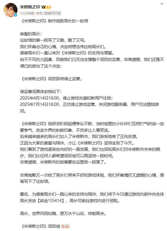 就在今天(4月14日)下午,距离公测(2024年10月17日)仅过去179天,《米修斯之印》便发布了停运公告:由于不可抗力因素,目前已经无法支撑整个项目的运营,游戏将于4月14日停止游戏充值与新用户注册,7月14日正式停止运营。据了解,背后的主要原因是项目收益不理想,投资者撤资。