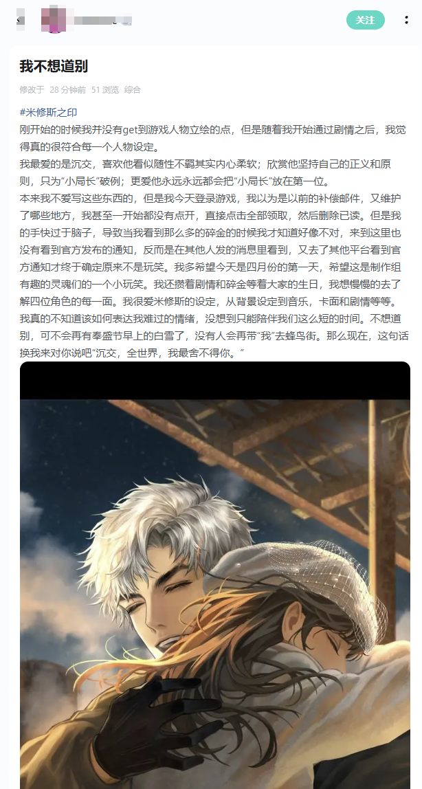坦白讲,以如今的游戏行业来说,产品停运早已不是件新鲜事,连大厂都不意外,更别说像《米修斯之印》这种“名不见经传”的小众乙游。——甚至可能还有很多人是因为停运公告才知道他们。
