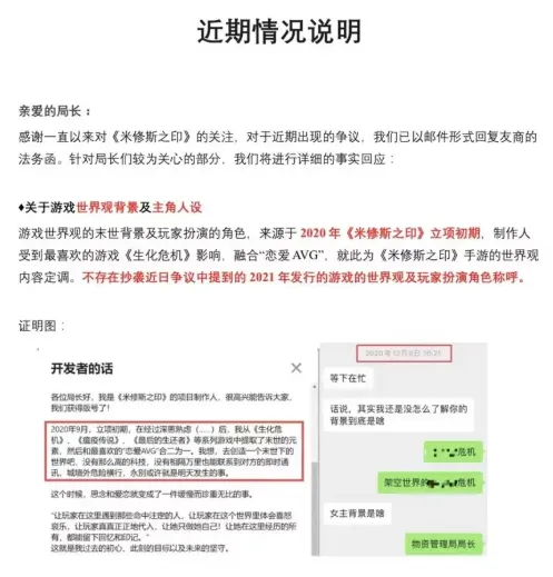 大量负面评论的出现使得《米修斯之印》好不容易建立起来用户逐渐崩盘,以至于官方不得不屡次发布公告,以回应外界的争议,其中不乏游戏立项时所做的人物设定,与投资者的聊天记录等内部消息。