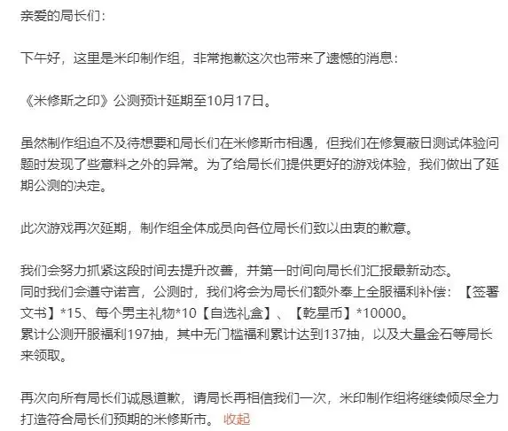 当“质疑”的种子被种下,再想拔除就没有这么容易了。在后续的计费测试里面,《米修斯之印》又出现了不同程度的问题,导致游戏的公测日期,从一跳再跳,从2024年的9月6日改到9月13日,后续又改到了10月17日。