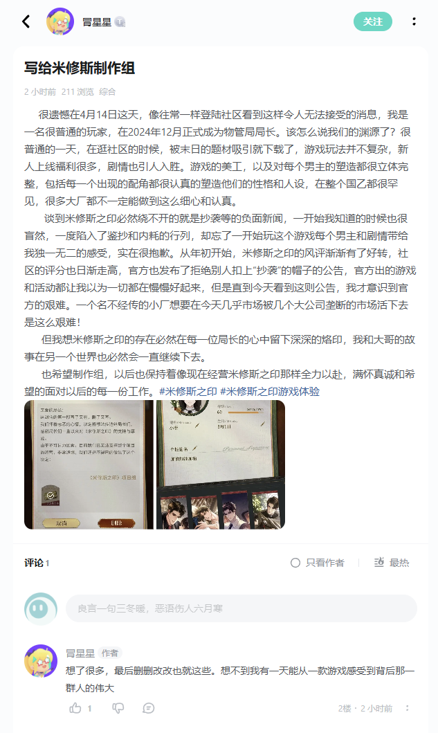 只不过,在如今许多喜爱游戏的玩家们心中,可能还会有些幻想:如果游戏再做完善一点?他们研发之路再顺利一些?如果当时自己少一些盲目的鉴抄和内耗,那么《米修斯之印》的结局会不会改变?彼此的告别会不会来得不那么突然。