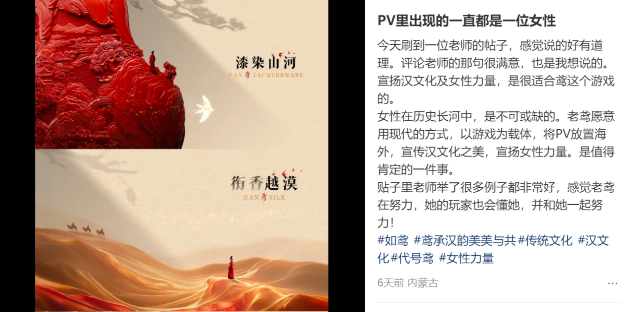 又比如,她们发起了“鸢承汉韵美美与共”全球创作征集,邀请世界各地玩家分享身边的汉文化元素。自启动以来,这场文化接力迅速席卷社交平台,相关话题阅读量突破1亿,讨论热度高达160万条,来自五湖四海的参与者纷纷晒出自己与汉文化的故事,让沉睡在各地的文化基因重新焕发生机。
